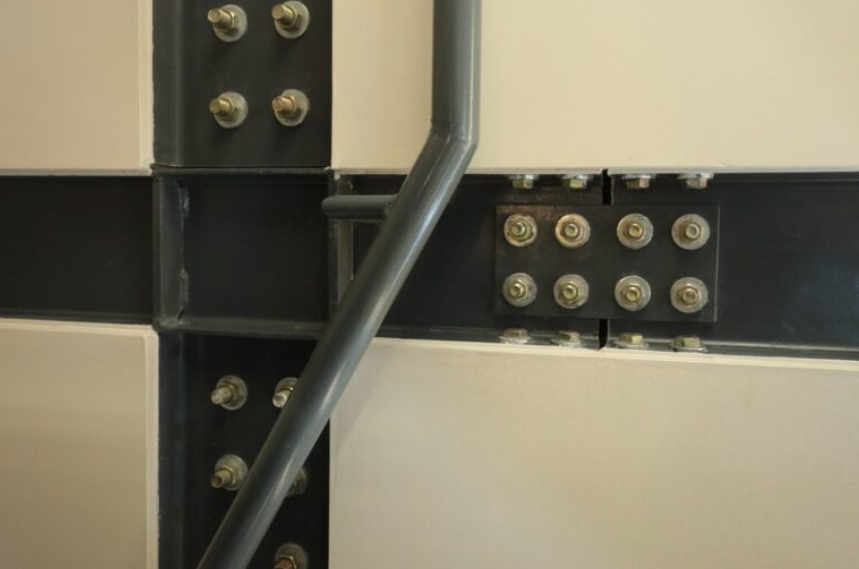 Por su lado, el proceso constructivo se aceleró con el encofrado autoportante del hormigón, pudiéndose trabajar en varios niveles simultáneamente. La estructura metálica de columnas, vigas y diagonales se unieron a su vez mediante tornillos y platinas. “El proceso de colocación de las mismas fue muy preciso ya que fueron agujereadas en fábrica para su montaje, al mejor estilo del juego Mecano”, detalló el profesional.